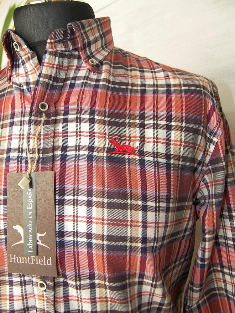 Interior de cuello y puños confeccionado con tejido de color uniforme en contraste. HuntField bordado sobre el lado izquierdo y cuello abotonado.
